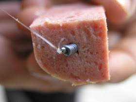 Fixed spool reel, loaded with 12lb clear mono. I prefer mono to braid for this method, as a lot of the swims I'm rolling baits through tend to be snaggy, rock or boulder strewn areas. Some bait will be required and the good old luncheon meat rules. I cut my meat into two slabs then into four, which leaves me 8 'fishfinger' type pieces. These are carried in a bait bag around my waist and I can tear off a piece the size I require. Obviously some forcepts are required for unhooking. Notice there is no mention of a landing net. As I'm in the river most of the time, and tend to play my fish very hard, so they are landed quickly, I rarely take a net with me, it just slows me down.